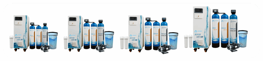 Rover cure, Sieve soft 50 (Automatic water softener) with brine tank, Sieve pro carbon 50 (Automatic Carbon Filter), Pressure tank 100 Lit., Pressure booster 0.5 HP, Single stage 20x4.5” cartridge filter.